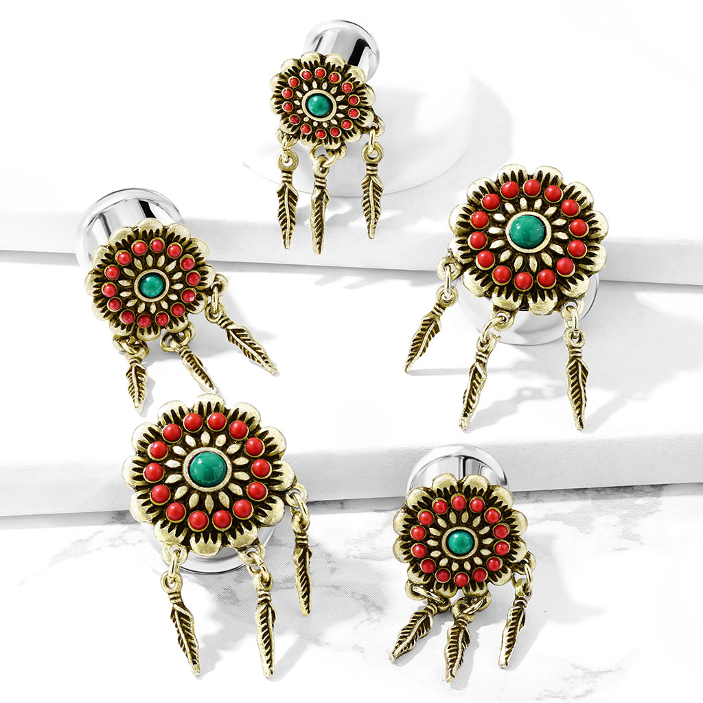 Plugs ir izgatavots no ķirurģiskā tērauda, un tas ir pieejams dažādos izmēros. Mazākais modelis ir 1/4 collas (6 mm), un lielākais ir 5/8 collas (16 mm). Zieda dekorācija ir misiņa izstrādājums ar zeltainu antīka stila pārklājumu.