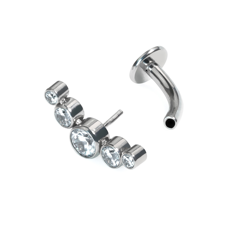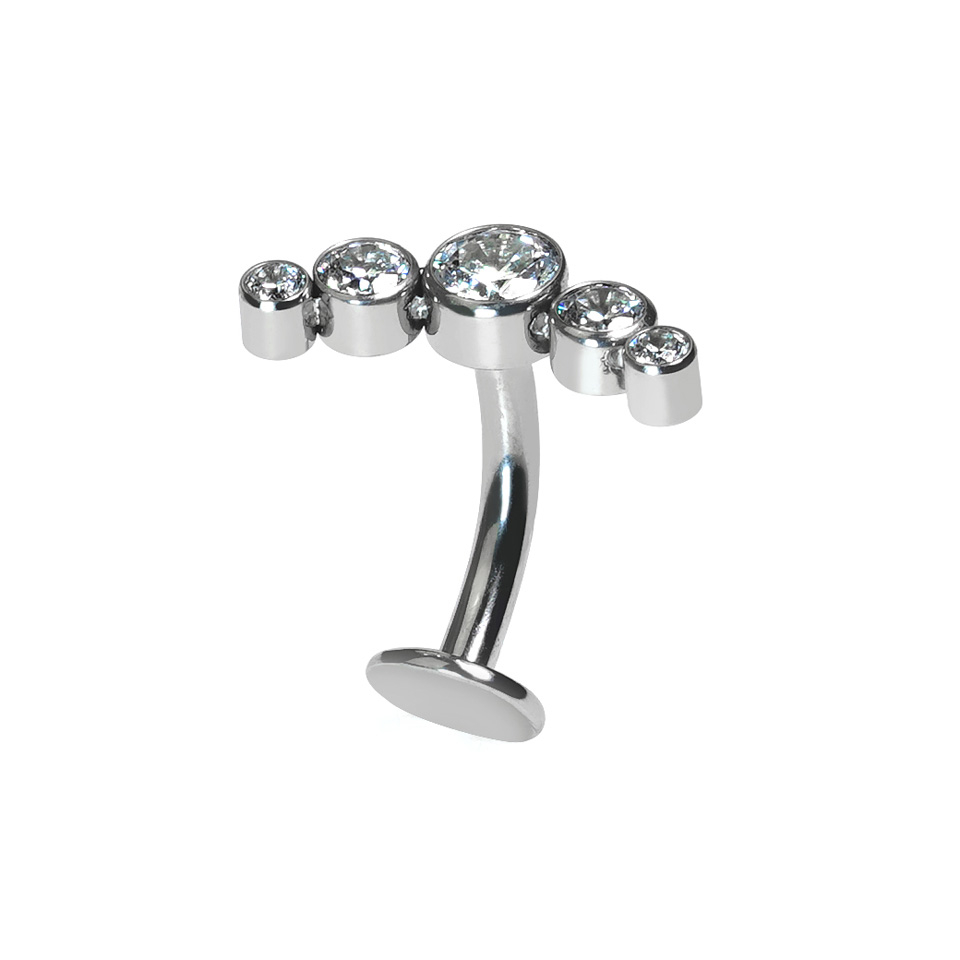 Šis reversais nabas pīrsings no titāna ir izgreznots ar pieciem kristāliem, kas ir iestrādāti ietvarā. Tā kā tas izgatavots no titāna, tas ir hipoalerģisks un ūdensizturīgs. Rotas aizdares mehānisms ir push-in: tas nozīmē, ka tās nostiprināšanai Tev vienkārši nepieciešams mazliet ieliekt kātiņu un ievietot to stienītī.
