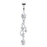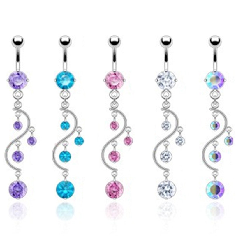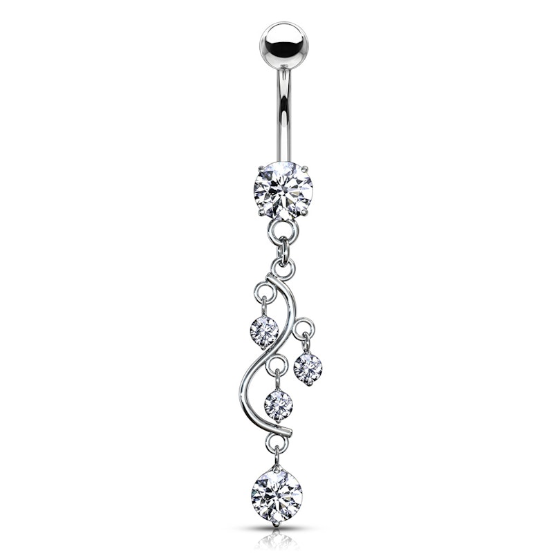 Nabas pīrsings ar s formas piekariņu un kristāliem