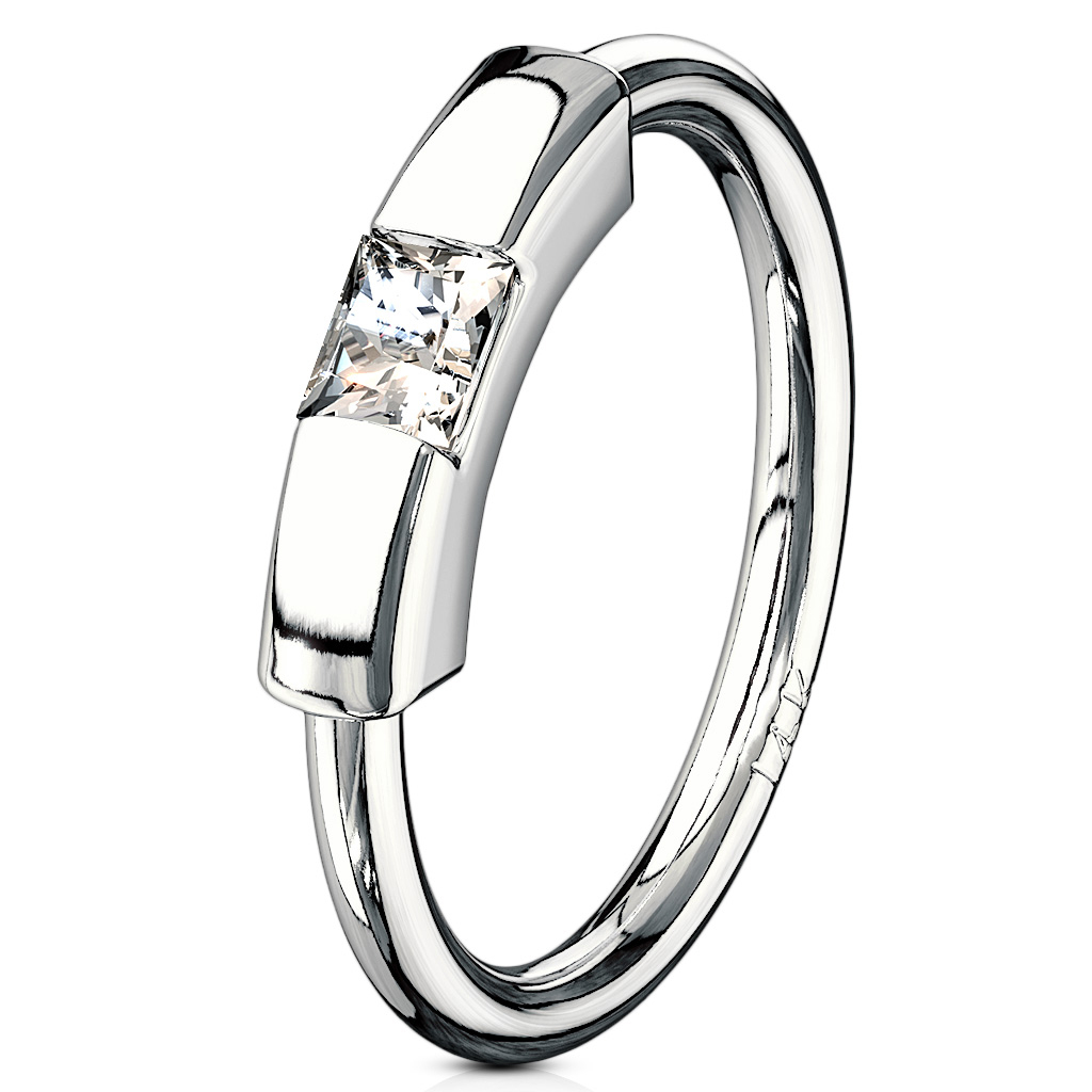 Šis skaistais un elegantais segmentētais gredzens ir izgatavots no 14 karātu zelta Tas ir lieliski piemērots, ja attiecībā uz rotaslietām esi izvēlīgs. Šim pīrsingu gredzenam ir nepārspējama kvalitāte un pārlaicīgs dizains. To dekorē ieliekts taisnstūris ar kvadrāta formas kristālu.
