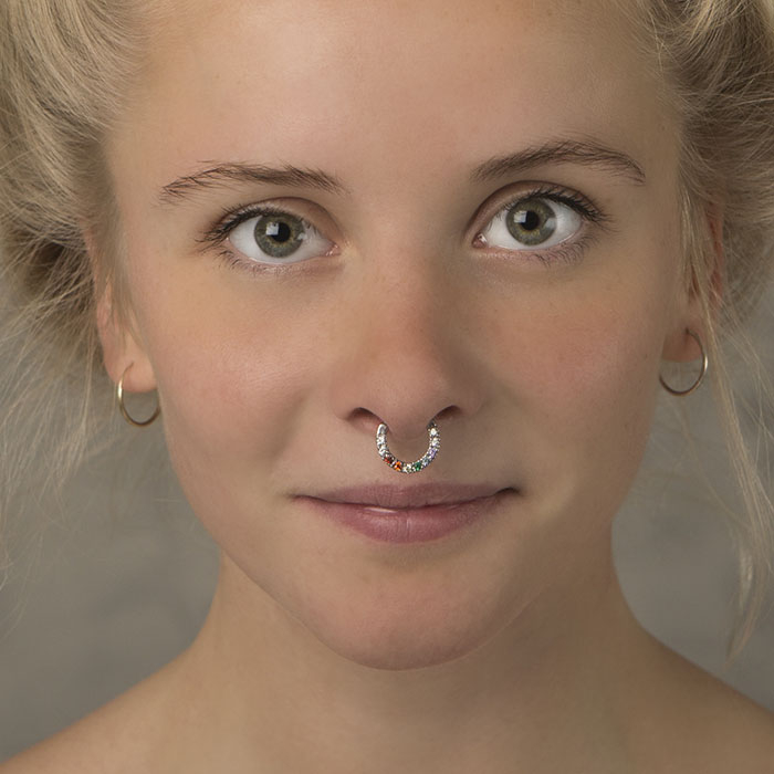 Ja meklē savam septum pīrsingam jaunu rotaslietu, kura būtu eleganta un skaista, Tev noteikti patiks šis mūsu piedāvātais septum pīrsinga gredzens jeb klikeris. Šim satriecošajam klikerim ir klasisks dizains, kas ir lieliski piemērots jebkurai dzīves situācijai un stilam. Tam ir viengabala riņķa forma, kas ir dekorēts ar desmit žilbinošiem akmentiņiem. Šī septum klikera struktūra ir pieejama divās dažādās krāsās: ķirurģiskā tērauda sudraba vai arī zelta pārklājuma krāsā. Sudrabs ir neapšaubāma klasika, bet zelts ir perfekti piemērots tiem, kuri mīl zeltītas rotaslietas. Turklāt, Tev tiek piedāvāti divi modeļi ar sešām, fantastiskām krāsas opcijām.