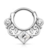 Ja jums ir septum pīrsings un jūs vēlaties to izgreznot to pēc iespējas skaistāk, tad šis lieliskais klikeris ir kā radīts jums! Šis septum gredzenam ir elegants, visos laikos aktuāls dizains: izsmalcināts gredzens bez jebkā lieka. Tajā ir skaisti vijumi starp brīnišķīgiem akmentiņiem, kuri ir pieejami dažādās krāsās. Tas ir riņķis ar klikera mehānismu, kuru var atklikšķināt vaļā un ciet. Mazais stienītis, kas iziet cauri jūsu septum pīrsingam, ir ieliektā formā, ierastā taisnā stienīša vietā. Tam ir riņķa forma, un tas izskatīsies vislabāk esot septum pīrsingā, jo tas neatradīsies pārāk tuvu degunam.