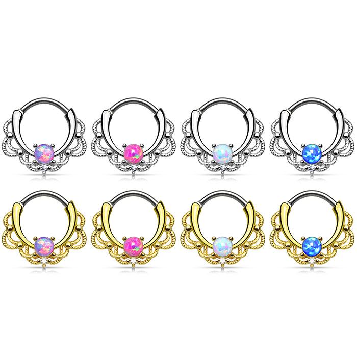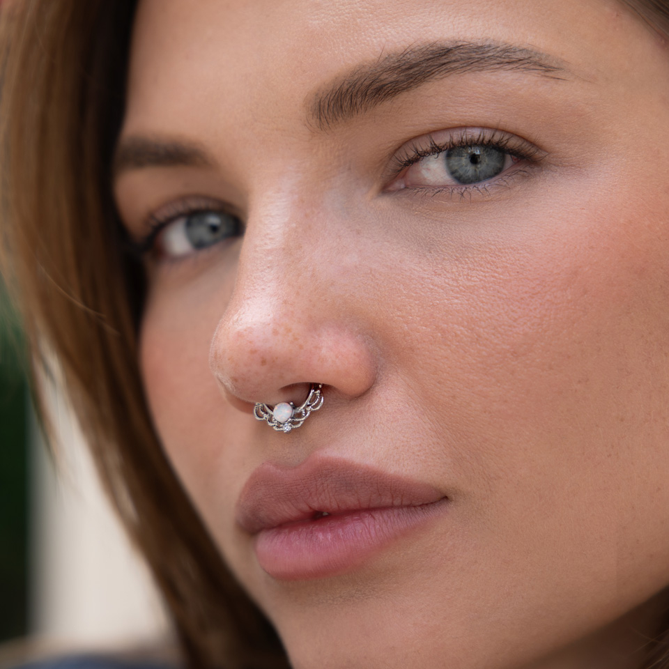 Gredzens ir platāks apakšdaļā, un tā centrā ir iekļauts skaists opāla akmens. Jūs varat izvēlēties starp četrām dažādām krāsām, katra no tām ar izteiktu izskatu. Turklāt, šis rinķis ir dekorēts ar ķēdēm un mežģīnēm līdzīgiem vijumiem. Ķēdītei, zem opāla, atrodas brīnišķīgs kristāliņš. Kopumā, septum gredzenam ir ekskluzīvs dizains.