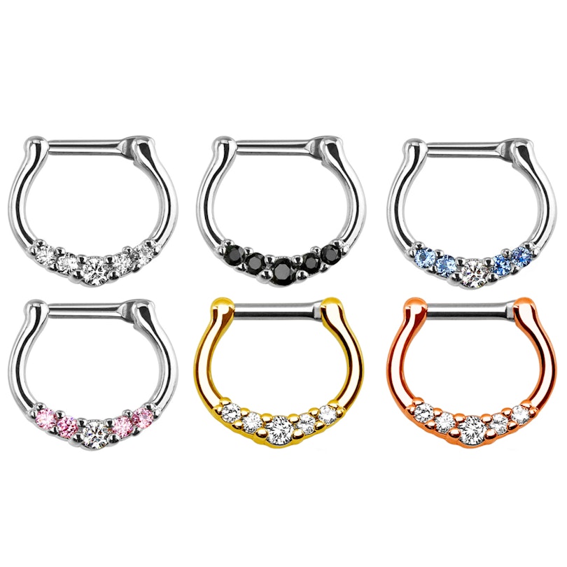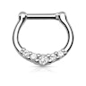 Piedāvājam izsmalcinātu septum klikeri, izgatavotu no ķirurģiskā tērauda ar pieciem skaistiem akmentiņiem. Apaļie kristāli grezno apļa izliekumu un piešķir papildu uguntiņas dizainam, izstarojot sievišķību. Vislielākais kristāls atrodas centrā, bet mazākie ir simetriski novietoti tā abās malās.