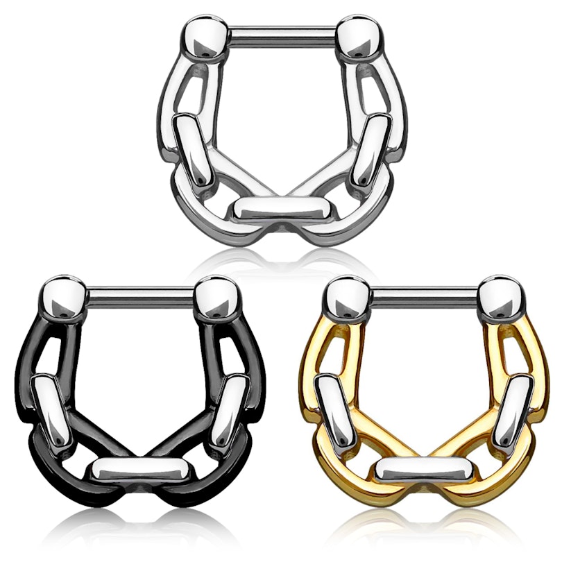 Šis septum klikeris ir izgatavots no tīra ķirurģiskā tērauda, un tajā nav misiņa, atšķirībā no vairuma septum gredzenu. Stienītis, kuru ir jāievieto cauri pīrsingam, ir 1/4 collas (6 mm) garš. Stienītis ir pievienots pie viena gredzena puses ar eņģi un tā otrā pusē atrodas aizdare. Ķēdīte ir fiksēta, tādēļ nekustēsies kā regulāra ķēde.