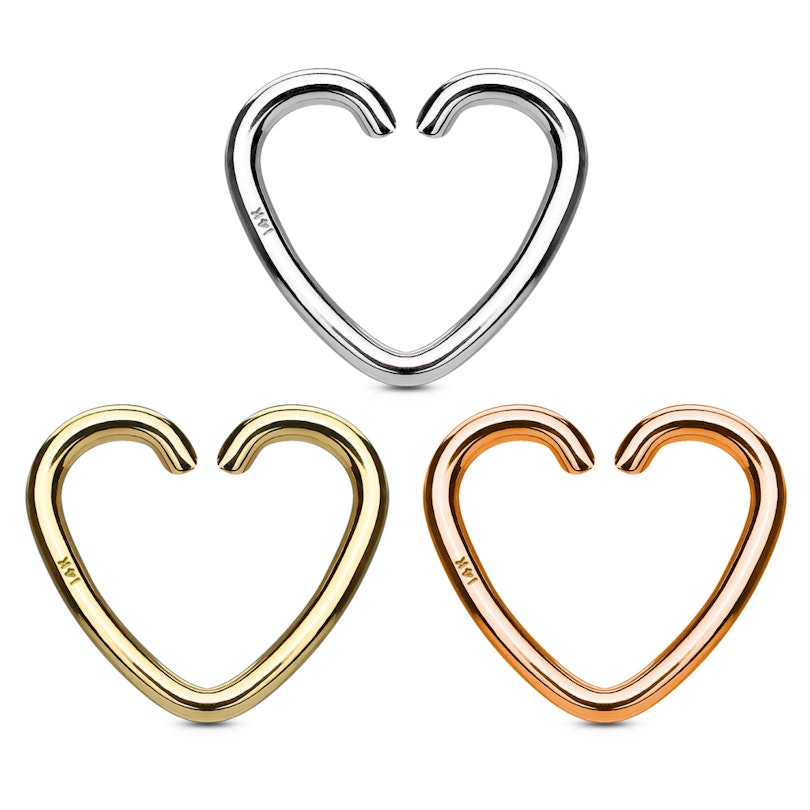 Jūs varat iegādāties dažādas šīs sirds versijas, kurā jūs varat izvēlēties zelta tipu, tāpat kā tā biezumu, kas derēs jūsu pīrsingam. Šīs sirds iekšējie izmēri: platums 10 mm, augstums 9 mm. Visiem modeļiem ir vienāds izmērs, izņemot to stienīša biezumu. Jūs varat nēsāt šo sirdi lielākā daļu pīrsingu, bet tie noteikti izskatīsies vislabāk; tragus, helix un daith pīrsingos.
