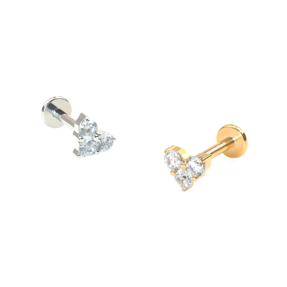 Šo titāna labreti rotā 3 cirkonija akmentiņi, kas izkārtoti sirds formā. Diviem augšējiem akmentiņiem ir apaļa forma, bet apakšējam - kvadrāta forma. Rotai ir iekšējā vītne un tā pieejama ar zelta vai sudraba krāsas pārklājumu. Šī piemīlīgā rotaslieta lieliski izskatīsies dažādos auss pīrsingos. Platākajā punktā tās izmērs ir vien 5 mm. Plakanā aizmugure nodrošina komfortablu nēsāšanu.
