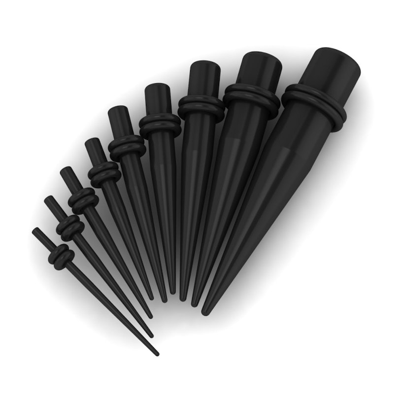 Komplektu veido 9 strečeri, sākot no 1.6 mm līdz 10 mm (14g līdz 00g):