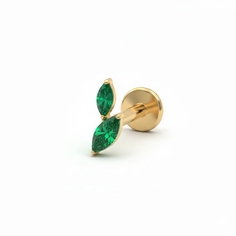 Titāna labrete ar diviem marķīzes slīpējuma akmentiņiem: pierādījums tam, ka smalkas rotas var būt izteiksmīgas. Divi iegarenie akmentiņi atrodas viens otram blakus, veidojot asociācijas ar lapām vai spārniem un tādējādi piešķirot Tavai auss rotu kombinācijai neuzkrītošu eleganci bez pārspīlējuma.