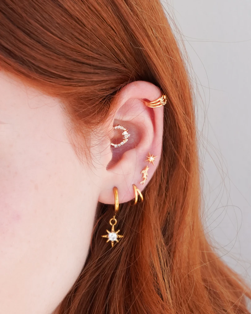 Novietojums: Tragus, Auss ļipiņa, Helix, Conch