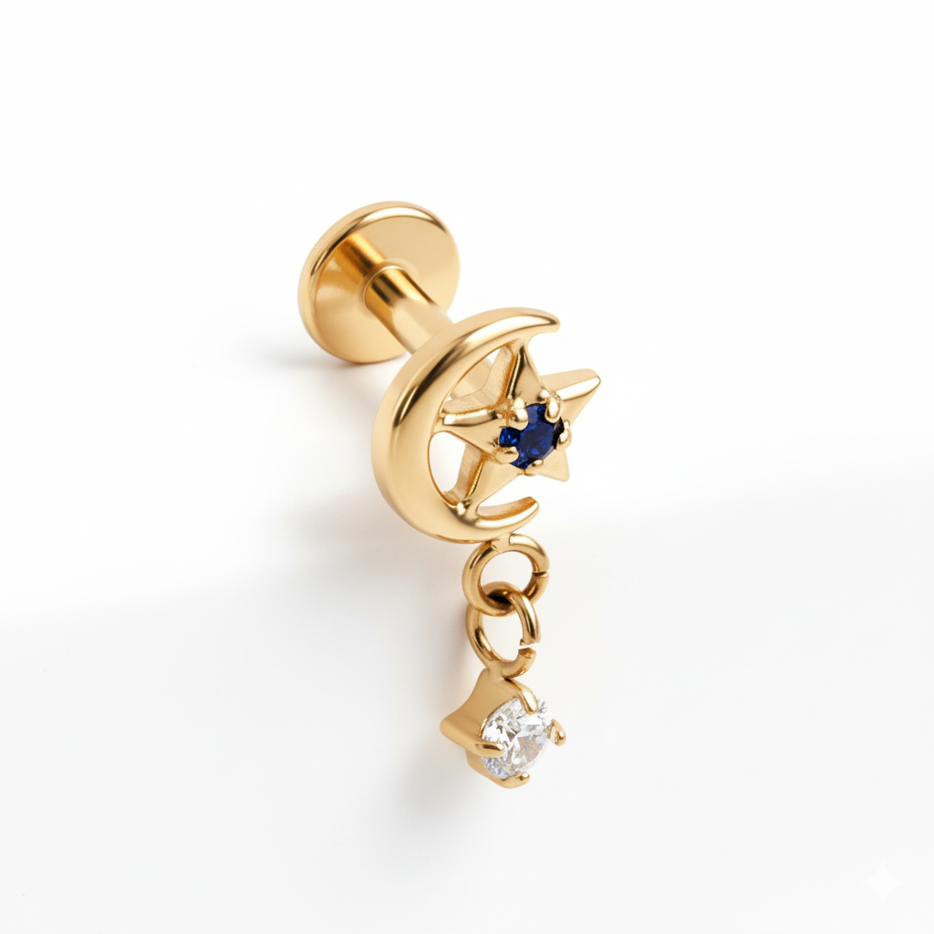 Titāna labrete ar mēnesi, zvaigzni un piekariņu piešķir Tavai ārienei nelielu kustību. Mazs mēnestiņš un zvaigznīte atrodas rotas priekšpusē, un smalks piekariņš maigi šūpojas, kad Tu kusties. Labrete ir dekoratīva un gaumīga, un tā lieliski der, ja vēlies kaut ko izteiksmīgāku. Pieejama ar zelta vai sudraba krāsas pārklājumu.