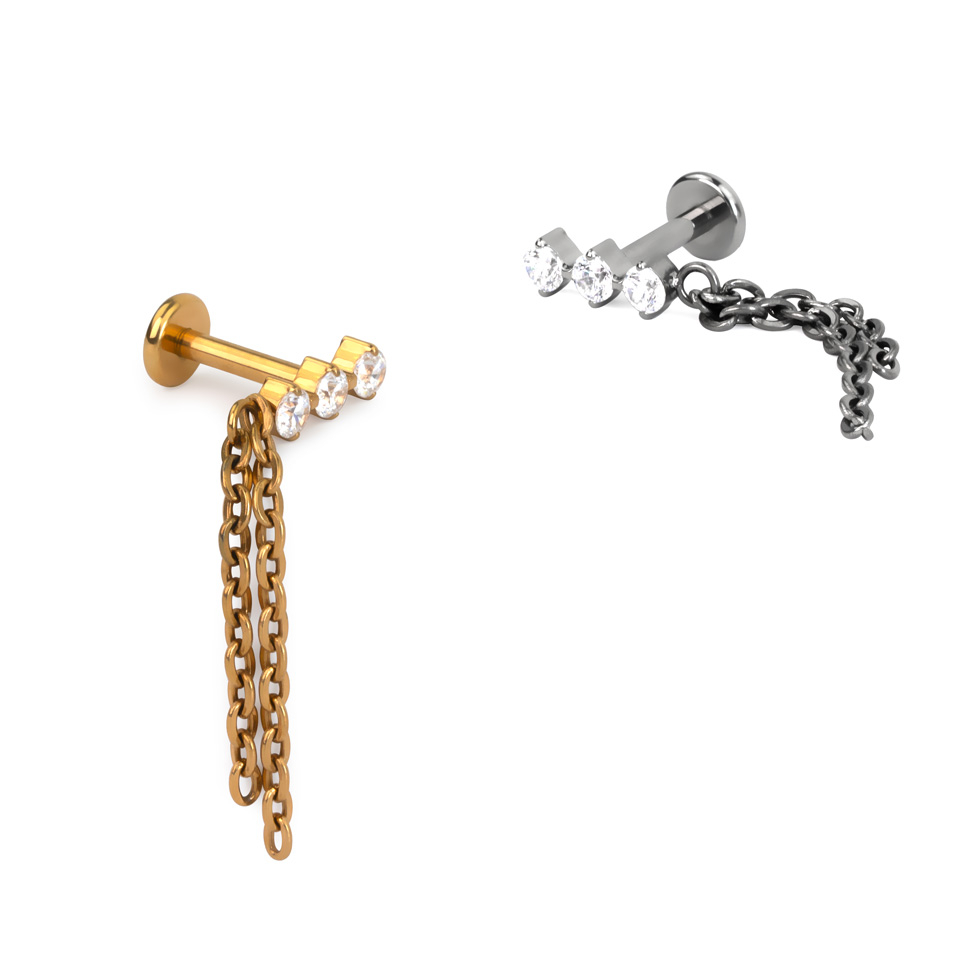 Šai stilīgajai labretei ir rindā izkārtoti un ietvarā iestiprināti cirkonija akmentiņi, kā arī divi ķēdītes piekariņi, kas vienā galā piestiprināti ar nelielu cilpiņu. Katrai ķēdītei ir cits garums, kas sniedz foršu asimetrisku efektu. Garākās ķēdītes garums ir 19mm. Šo rotu var nēsāt horizontāli auss ļipiņā, kā arī vertikāli vai leņķī citos auss pīrsingos - ļauj vaļu iztēlei, lai izveidotu savu tēlu.