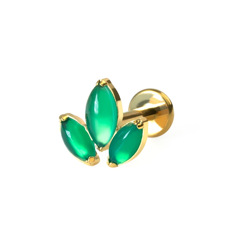 Šo stilīgo labreti rotā trīs zaļi marķīzes slīpējuma akmentiņi, kas izkārtoti lotosa zieda formā.