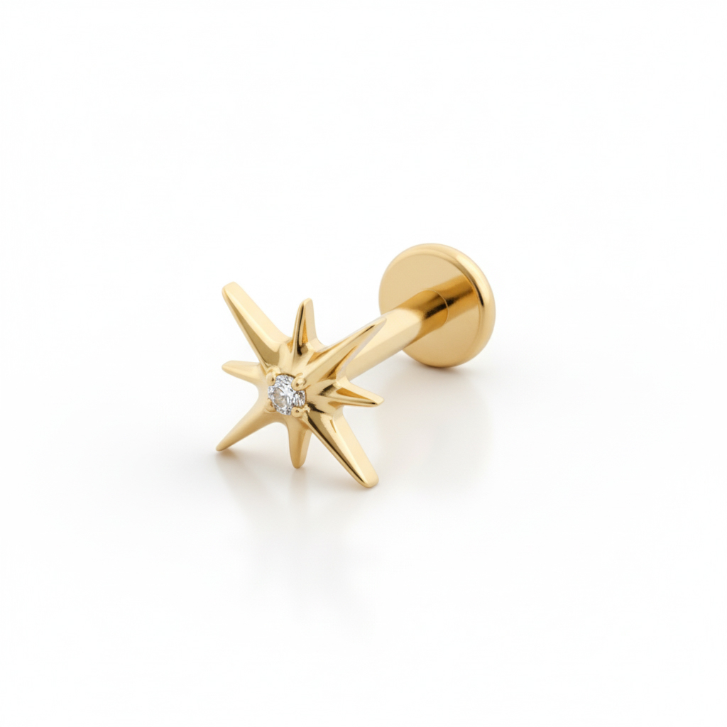 Titāna labrete zvaigznes formā ar centrālo akmentiņu ir radīta tiem, kas vēlas savām rotām nedaudz kosmisku noskaņu. Labretes zvaigznes formas dizaina centrā ietverts akmentiņš. Rota pieejama ar zelta vai sudraba krāsas pārklājumu un tā kļūs par pamanāmu sastāvdaļu ikvienā auss rotu kombinācijā.