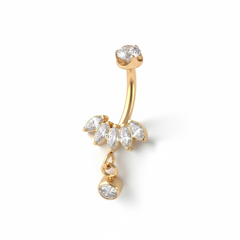 Tā dizains? Mirdzošs marķīzes slīpējuma akmentiņu kopums, kas skaisti iegulst Tavā nabā, ko papildina smalks piekariņš, kas atstaro gaismu ik reizi, kad Tu kusties. Šī rotaslieta pieejama zelta un sudraba krāsā, tādēļ Tu vari izvēlēties savam stilam atbilstošāko toni. Iekšējā vītne ļauj rotu viegli lietot bez liekas piņķerēšanās, un, rotas dizaina dēļ, mēs iesakām mērenu lietošanu.