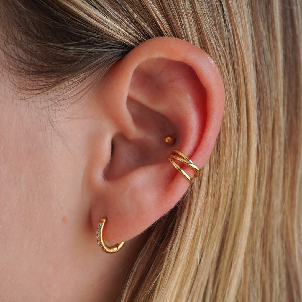 Minimālistiskas līnijas un nedaudz struktūras. Trīskāršais savītais auss kaffs apvieno sevī trīs gludas stieples, lai piešķirtu Tavam tēlam izteiksmīgumu un balansu.