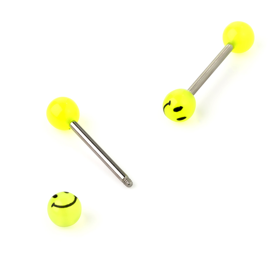 Mēs piedāvājam piemīlīgu un jautru mēles pīrsinga stienīti ar tumsā spīdošiem bumbiņveida uzgaļiem, vienu no tiem rotā smaidīga sejiņa.