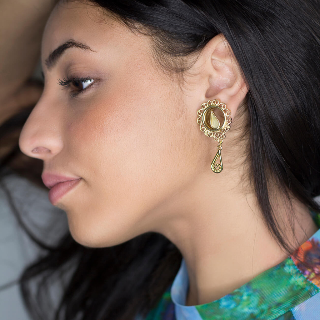 Tunelim ir divas asaras jeb lāses: viena brīvi nokarājas zem tuneļa, bet otra ir ievietota tā centrā, kurā arī ir ieklāta pērļgliemene. Rāmi veido interesantu vijumu vainags ar filigrānu rakstu.