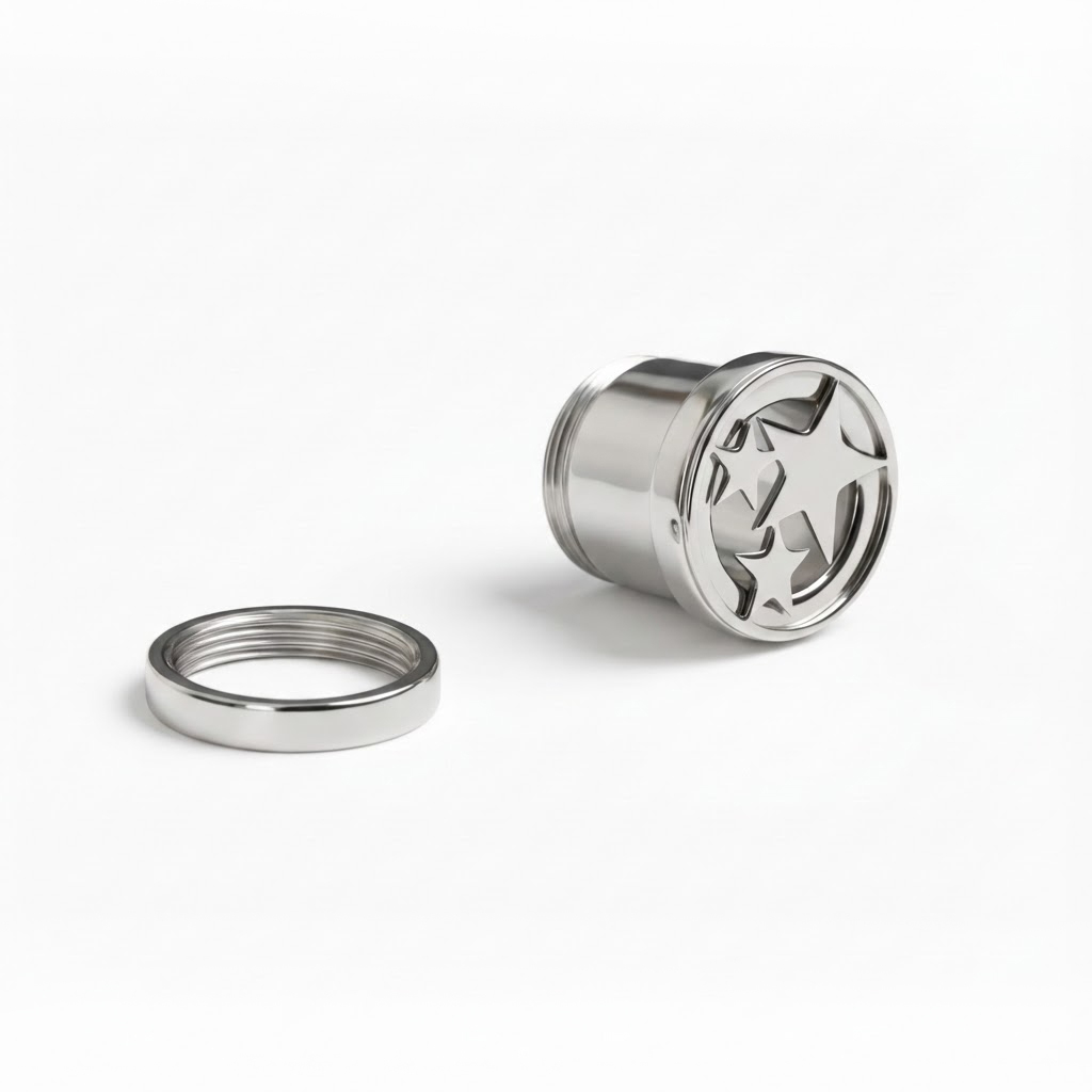 Izgatavots no ķirurģiskā tērauda, tas ir izturīgs, ūdensizturīgs un piemērots lielākajai daļai ādas tipu. Ārējā vītne ļauj rotu viegli lietot. Ievieto tuneli pīrsingā, uzskrūvē tā aizmuguri un - gatavs.