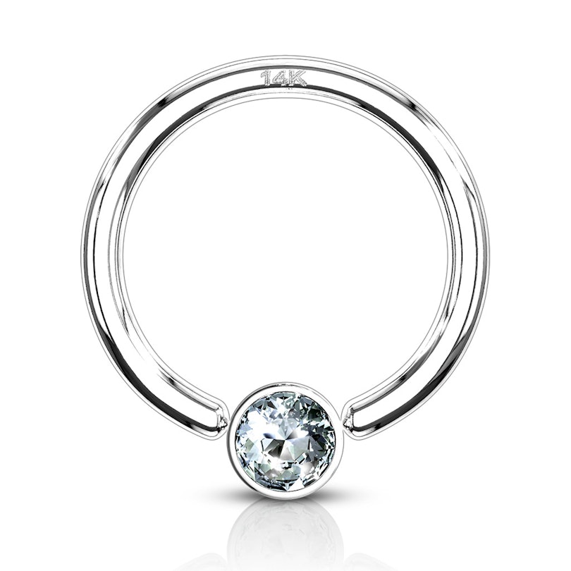 Mēs piedāvājam īpaši izsmalcinātu pīrsingu gredzenu ar satvertu lodīti, izgatavotu no 14 karātu zelta, ar ietvarā ievalcētu, mirdzošu kristāldzidru akmentiņu. Tu ne tikai iegūsi augstākas kvalitātes produktu, bet arī rotaslietu ar izsmalcinātu stilu.