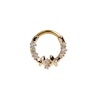 Šis ļoti piemīlīgais uz priekšu vērstais pīrsingu gredzens ir izgreznots ar diviem taureņiem, kurus ieskauj smalki cirkonija akmentiņi. Tā kā gredzena aizdares mehānisms ir eņģīte, rotaslietu ir viegli nostiprināt Tavā pīrsingā.