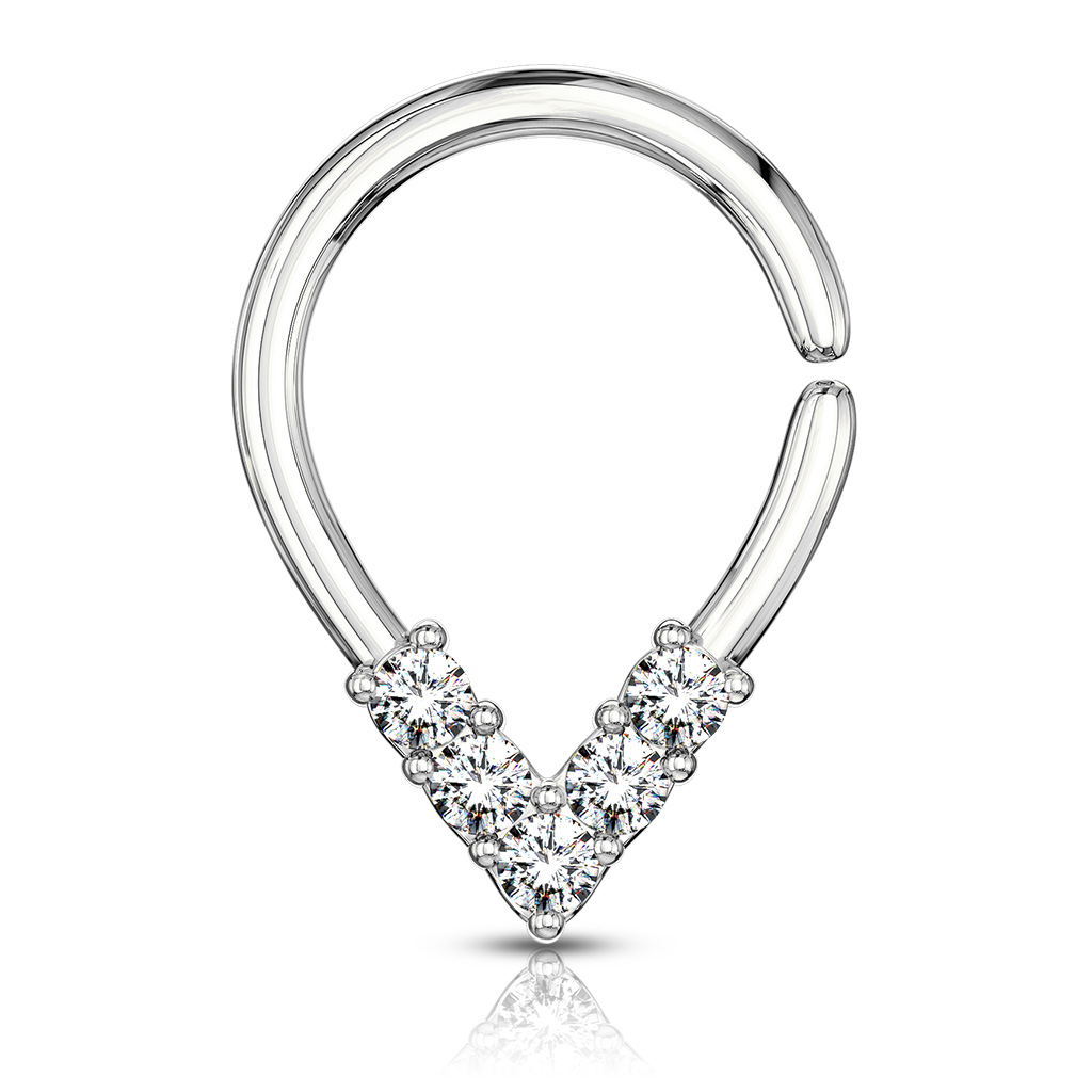 Rotaslietas apakšdaļā ir pieci kristāldzidri akmentiņi, kas piešķir pīrsinga gredzenam eleganci.