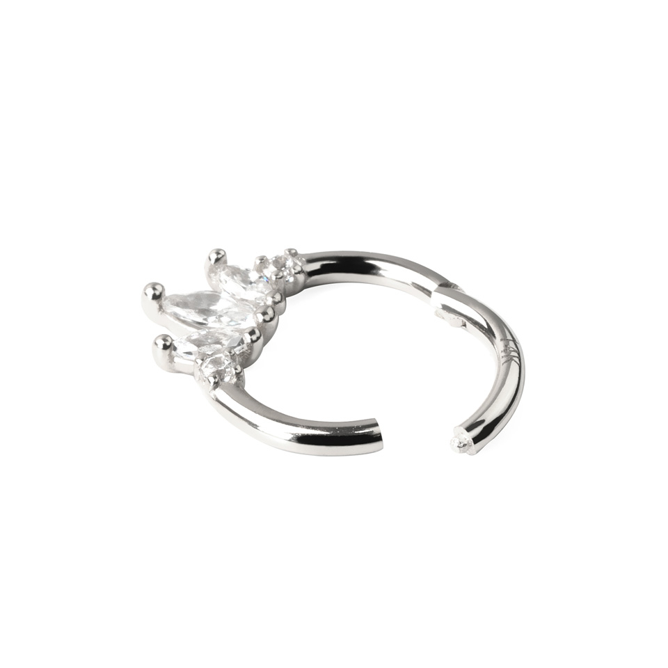 Pīrsinga gredzena lejasdaļu rotā pieci kristāliņi. Divi apaļi kristāliņi un starp tiem trīs ovālas formas kristāli. Pats lielākais ir vidējais ovālās formas kristāls. Kopumā tie veido burvīgu kristālu kaskādi, kas izgreznos jebkuru pīrsingu.