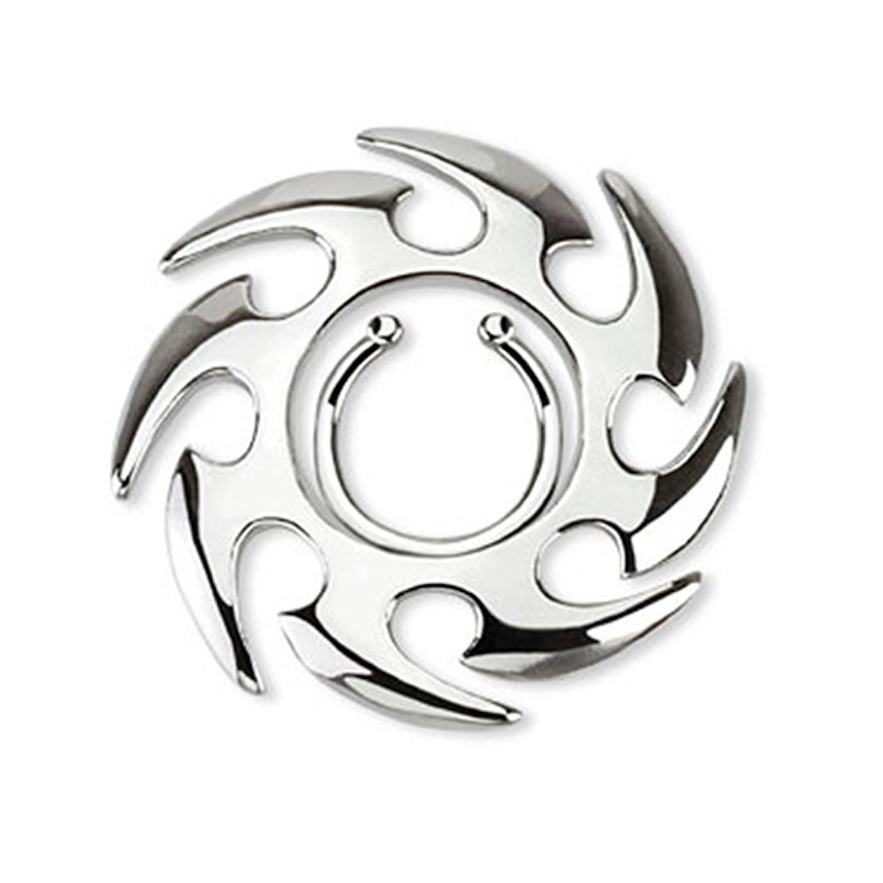 Ši ir jūsu iespēja iegādāties šo fantastisko krūtsgala gredzenu ar tribal jeb cilts sauli, ar spirāles formas dizainu. Krūtsgala vairogs sastāv no skaistām tribal/cilts liesmām, kas sniedzas uz visām pusēm, it kā gredzens grieztos apkārt. Tā centrā ir neliels klipsis, kuru jūs varat aplikt apkārt krūtsgalam un viegli to saspiest, lai tas turētos vietā.