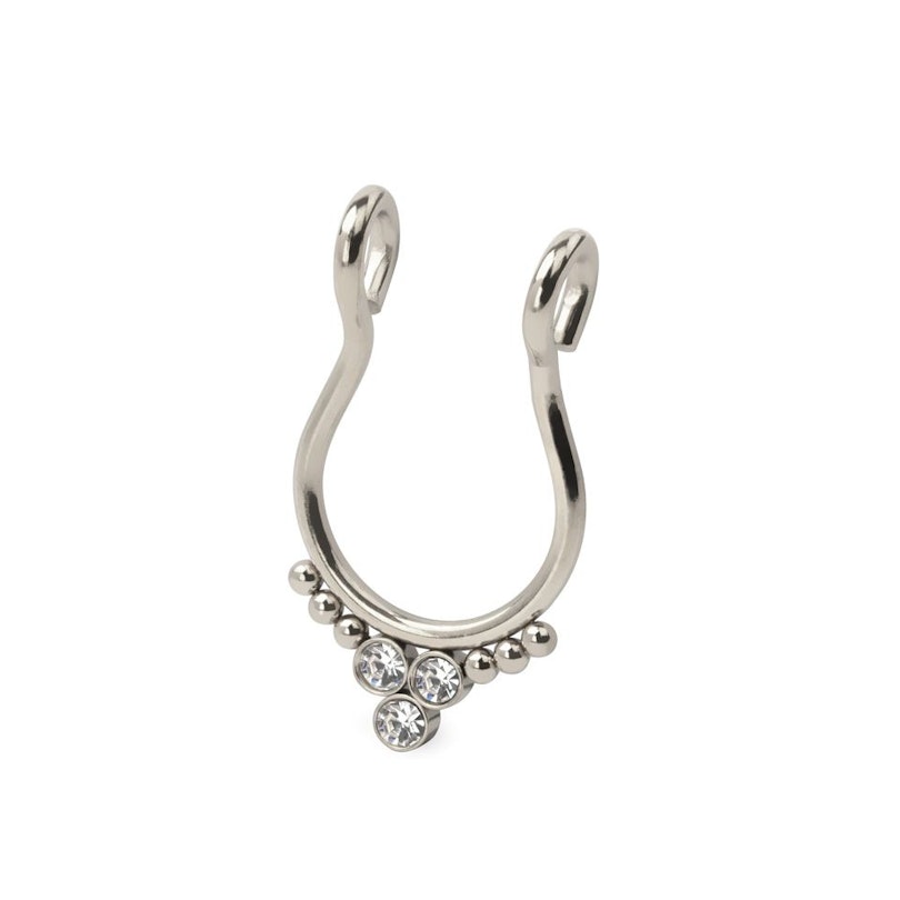 Nosaukums: Viltus septum pīrsingu gredzens ar trīs akmentiņu un lodīšu rotājumu